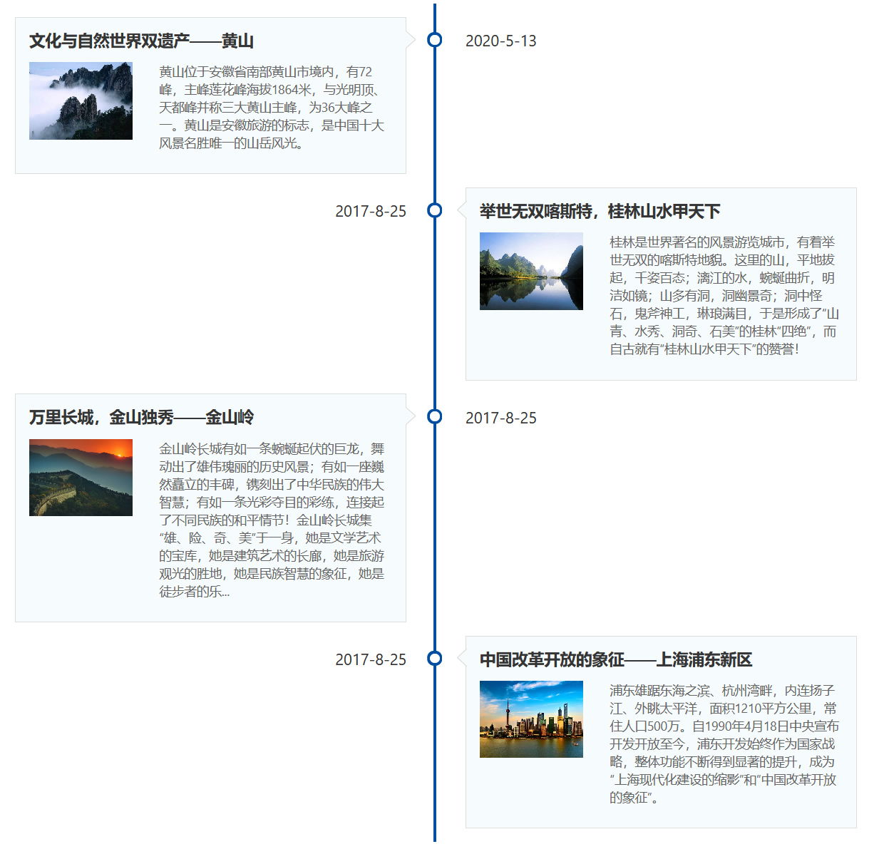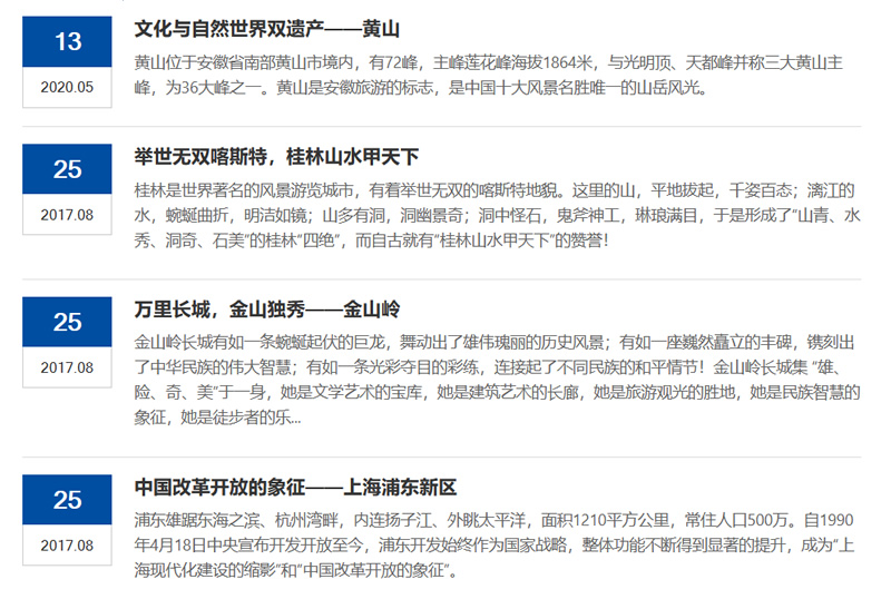 例如下列图片就是我们截取了几个典型的内容列表样式,包括“标题+摘要”、“横向图文”、“幻灯片”、“时间轴”。