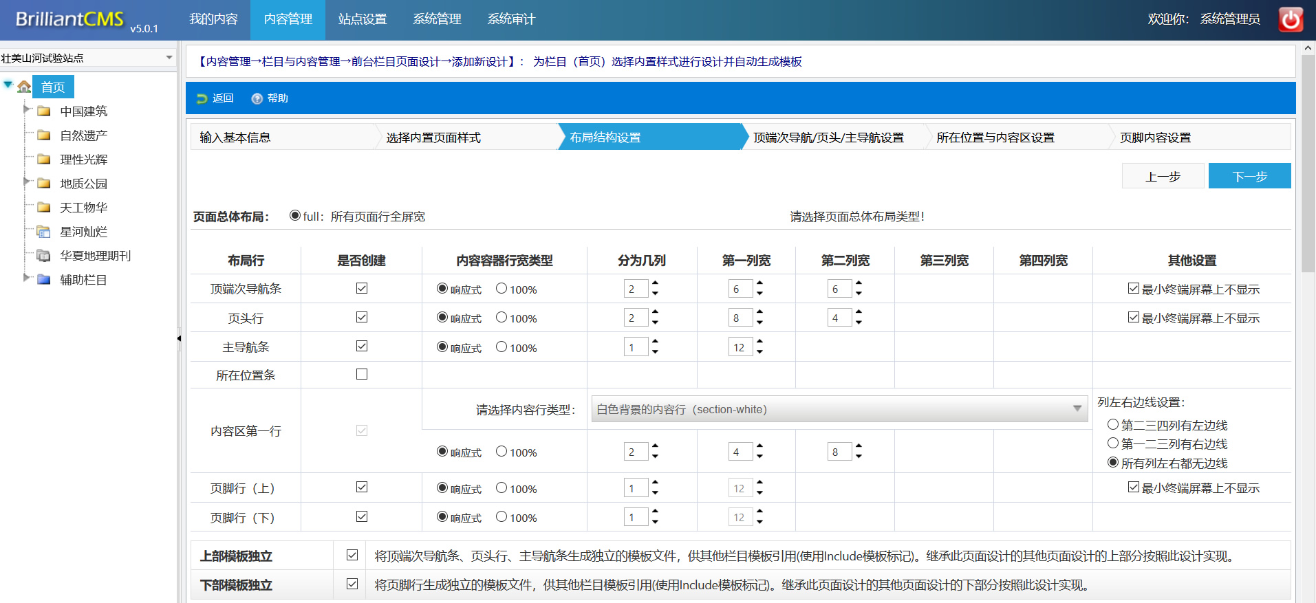 选择好页面样式后,接着进行页面布局的设置,下图中,你可以一次性地为各布局行(顶端次导航条、页头行、内容区、页脚等)按照Bootstrap12等分法分列,即总宽度为12,你可以6+6、5+7、3+4+5、4+4+4、3+3+3+3这样分列。