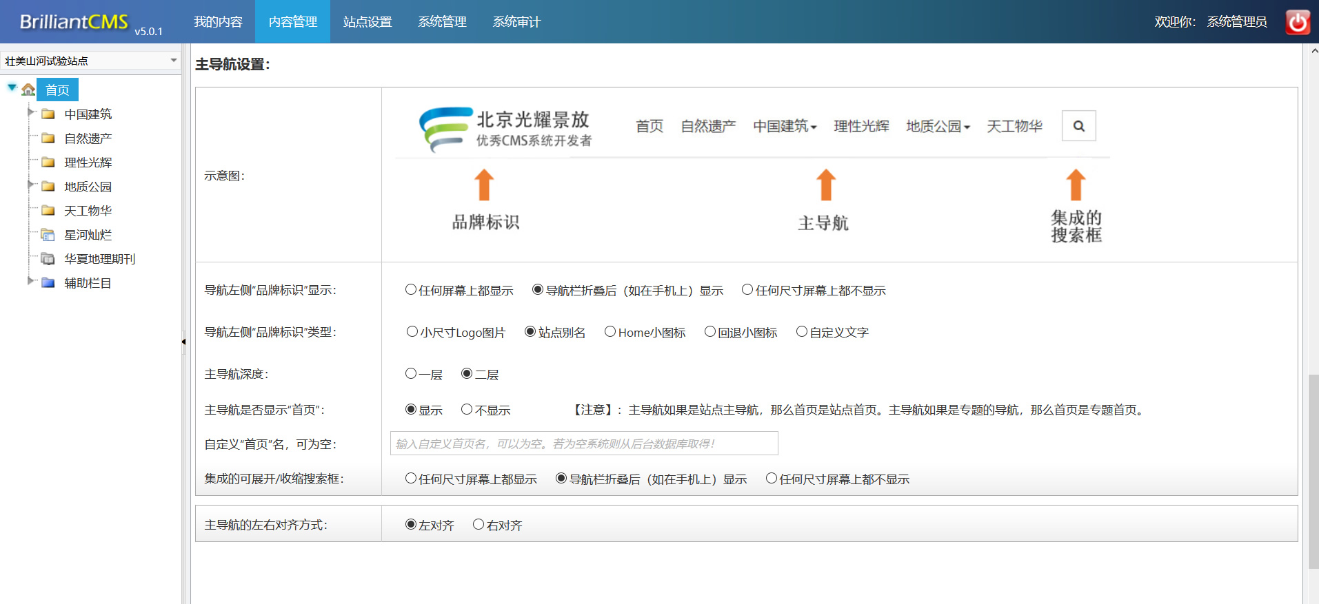 接着可以为顶端次导航条、页头、主导航设置选择项与参数,例如主导航是否集成搜索框,主导航深度等。