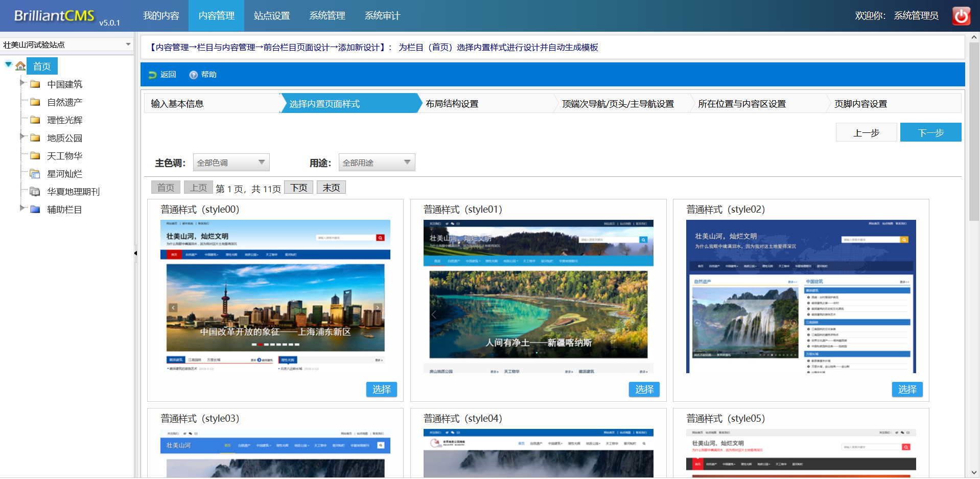 使用此功能,用户只需要选择BrilliantCMS系统提供的几百套各种颜色、各种风格的页面样板,自己定义好“几行几列”的页面内容布局,然后在这些列中根据需要创建出内容区块,选择内容来源栏目、选择需要的内容样式(如标题列表、图片集、图文混排、视频等),然后让系统自动生成模板。使用此功能,你仅需要一两个小时,就可以建好一个完全遵循HTML5/CSS3标准的、支持不同终端(桌面机、平板电脑、手机)、灵活而漂亮的站点、专题。