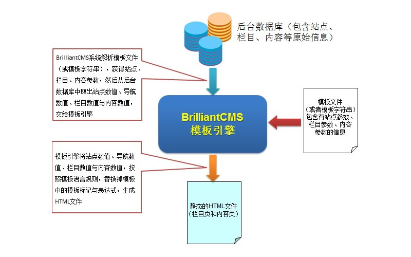 BrilliantCMS系统生成页面的核心,是一个模板引擎,这个模板引擎从页面模板读取站点参数、栏目参数、内容参数等,然后从数据库中取得这些参数的值、替换掉模板中的模板标记与表达式,生成HTML页面。