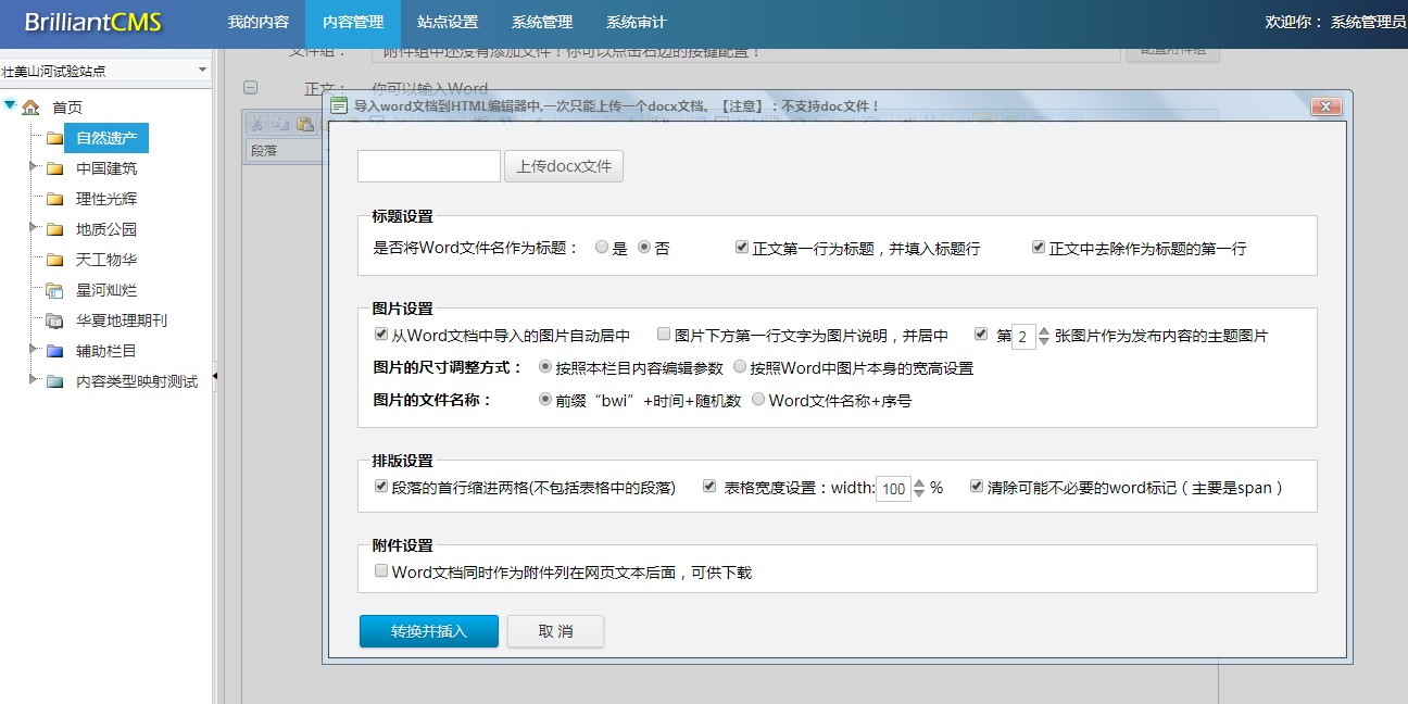 BrilliantCMS内容管理系统提供了一个直接上传并解析Word文档的功能,点击HTML编辑器中的Word上传按钮,弹出窗口,你可以上传Word文件,并且设置Word转换为HTML时的多个参数,例如,Word中的图片,如果宽度大于预先设置好的800px像素,系统直接裁剪成800px宽,并存储在服务器上,也可以设置图片自动居中。另外也可以设置表格的宽度。