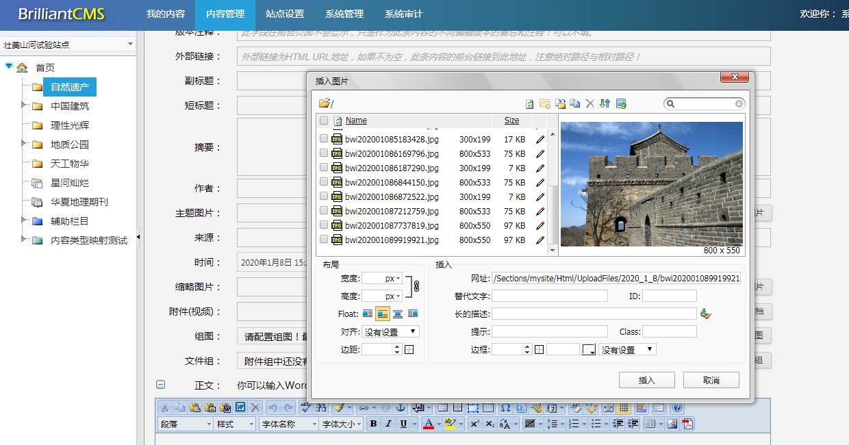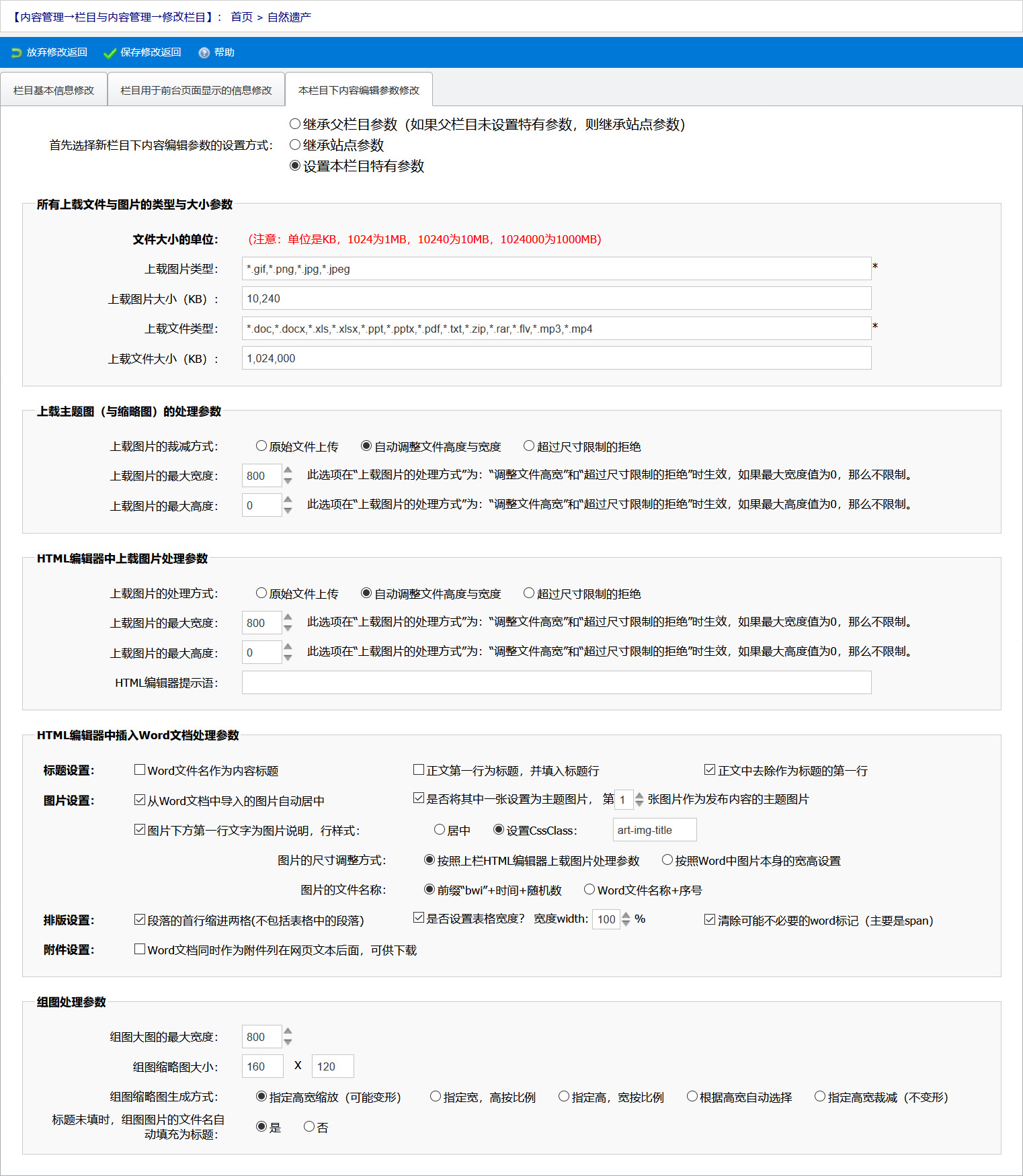 针对信息录入人员不懂得裁剪图片,常常把好几兆的图片直接上传到网站上的痛点,BrilliantCMS内容管理系统可以为每个栏目设置内容编辑参数,例如下面的截图中,我们为栏目“首页>自然遗产”设置内容编辑参数,其中,上载图片的最大宽度定义为800像素,上载图片的裁剪方法为“自动调整文件的高度与宽度”,这样当信息录入员上传宽度大于800px的图片时,自动裁剪为800px宽。