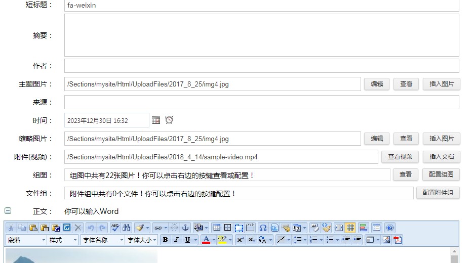BrilliantCMS支持组图功能。在创建内容时,除了标题、作者、来源、时间、正文等字段,还可以有一个组图字段。